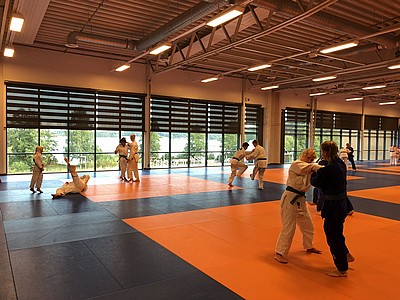Trots det varma härliga vädret så är vi ca 25-30 på mattan vid varje pass i blandade åldrar, mycket roligt att se så många kämpa i värmen.